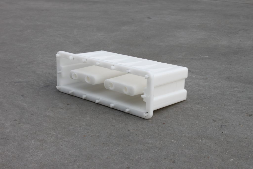 而這個塑料空心磚模具主要采用兩孔設計,因為水泥混凝土密度較重,在加上塑料材質的模具基本都具備一定韌性,填充量過多易導致模具膨脹使得水泥空心磚成品變形,所在模具四周均采用加強筋設計,對于防止這種情況的發(fā)生作用還是相當穩(wěn)定的。