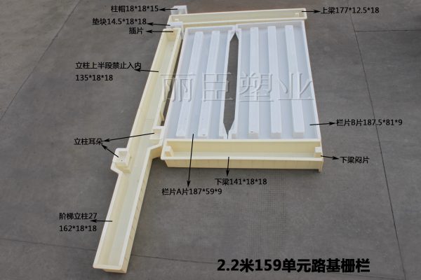 2.鐵路防護(hù)柵欄模具上下梁,均采用ABS材質(zhì),上梁尺寸為177*12.5*18CM,下梁尺寸為141*18*18CM,及配備下梁悶片。