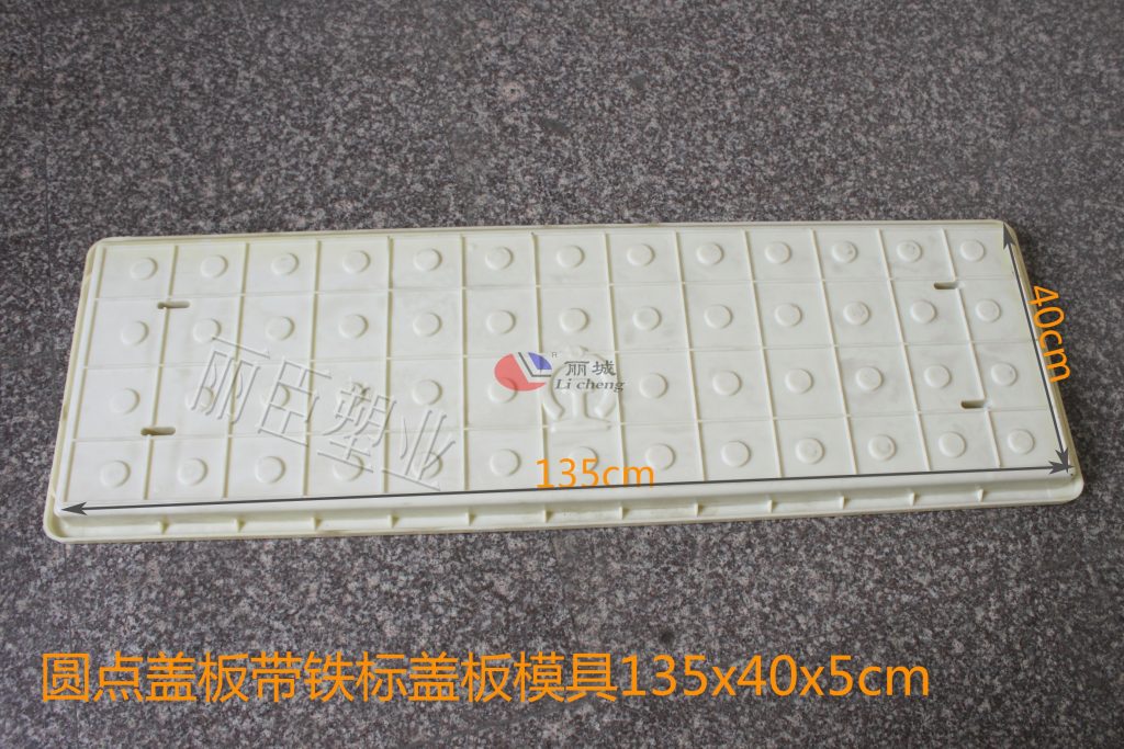 這款四孔圓點蓋板模具的尺寸為長135cm、寬40cm、高為5cm,用料上采用穩(wěn)定性較強的ABS為注塑原料,在澆筑水泥制品過程中能更好的保證砼制品模具不會發(fā)生變形,在對蓋板模具的四周添加了加強筋,小三角樣式更好的支撐塑料蓋板模具邊緣。
