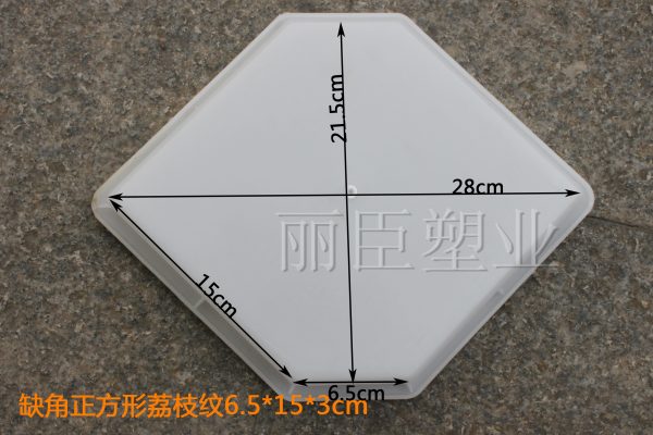 此產(chǎn)品專供西安客戶的一款彩磚模具,主要結(jié)構(gòu)以正方形缺角形狀設(shè)計(jì),其中底部為荔枝紋圖案,即所預(yù)制水泥彩磚成品表面為防滑荔枝紋圖案。此西安彩磚模具對(duì)角對(duì)稱長(zhǎng)度為28CM,缺角對(duì)稱長(zhǎng)度為21.5CM,詳細(xì)見(jiàn)下圖。