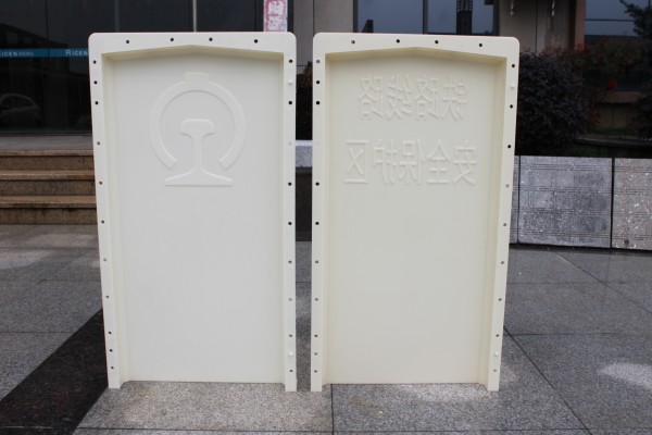 水泥警示牌模具使用ABS材質(zhì)注塑工藝制造,主要分為2個部分。正面為標有“鐵路線路安全保護區(qū)”字樣,反面為一個中國鐵路圖案,配件方面主要為2個主體部分組裝時所需要的螺絲螺帽。主要應(yīng)用為水泥混凝土警示牌預制,主要功能是在中國鐵路建設(shè)中,提醒人們?yōu)榇颂帪殍F路線路安全保護區(qū),在施工等一系列活動中需注意國家鐵路的安全。