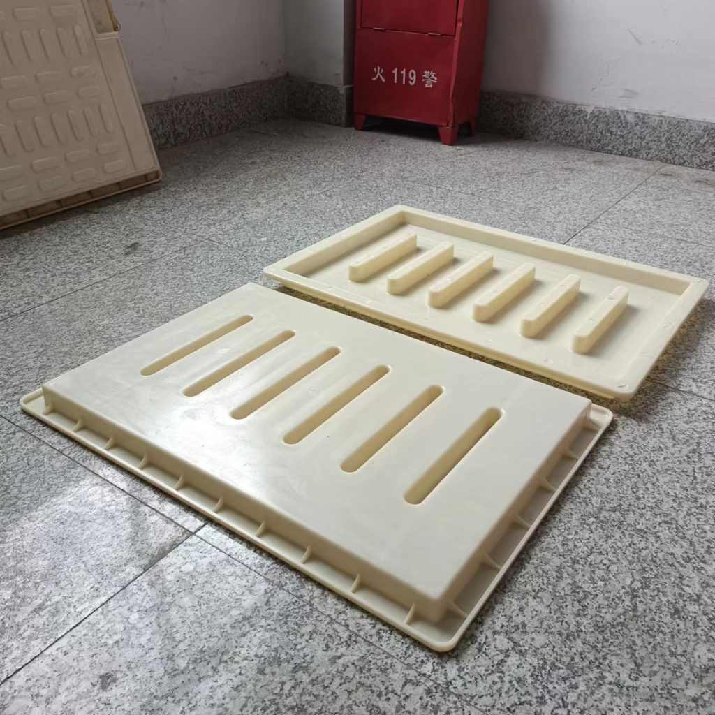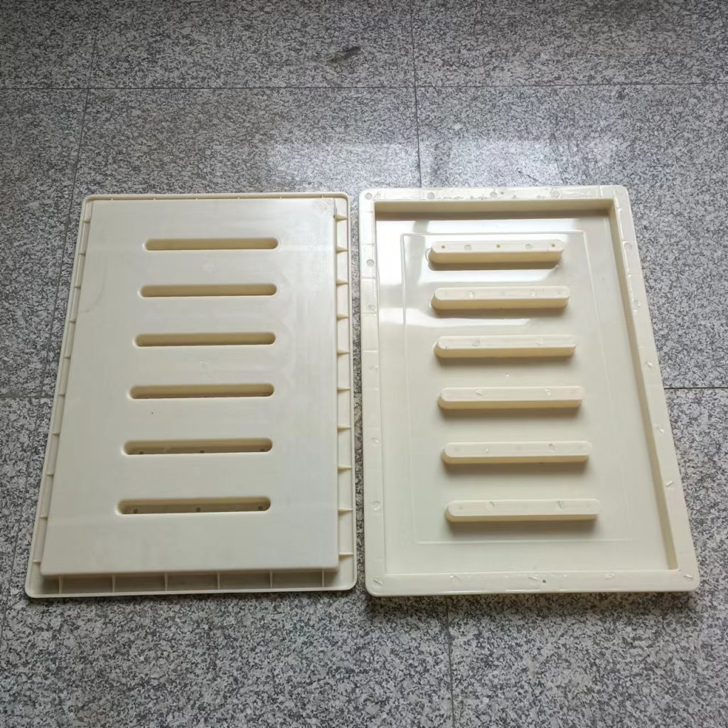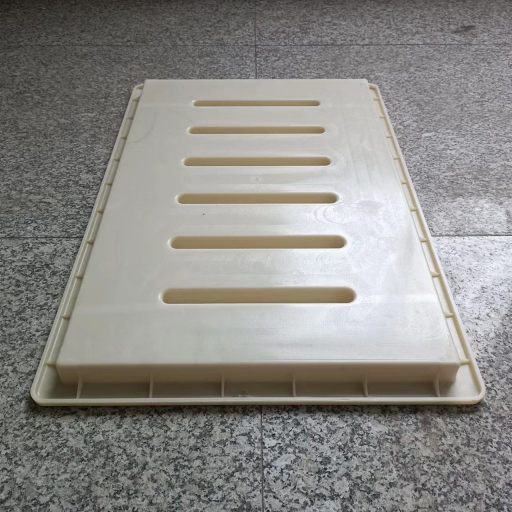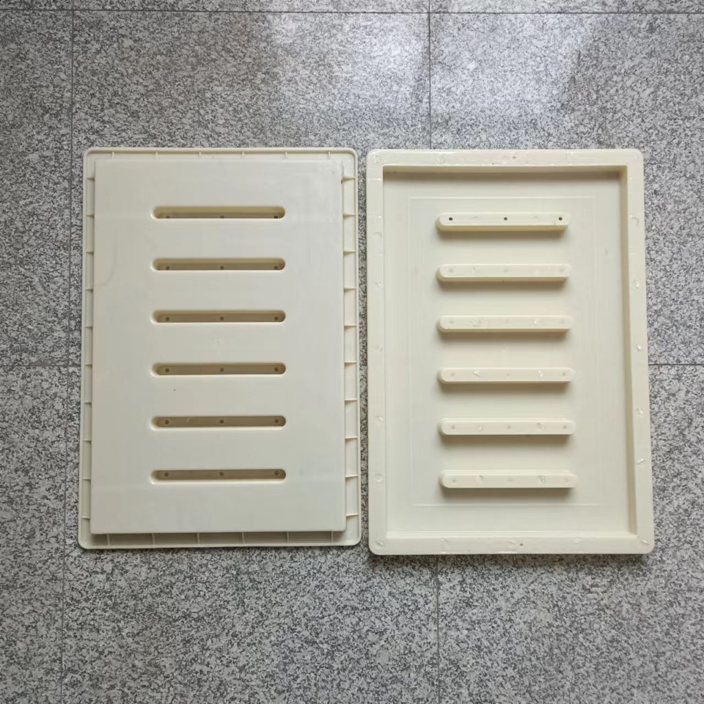 這款塑料雨水蓖模具厚度只有3cm,長寬尺寸為60cm*40cm,他主要用于下水、流水蓋板活性混凝土預(yù)制(RPC)預(yù)制,他的厚度較薄,與一般材質(zhì)的雨水蓋模具不同,他采用的材質(zhì)是ABS材質(zhì),這種材質(zhì)質(zhì)地比PP材質(zhì)硬,強度大,使用次數(shù)多,這種模具主要預(yù)制成型雨水蓋板,普通用于市政道路路面排水使用。他一共有六個排水孔,排水效果很好。水流效果比較好