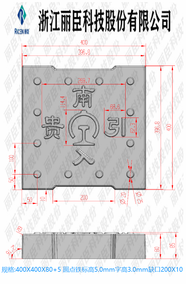 貴南引入系列蓋板,主要用于高鐵隧道蓋板定制系列、蓋板為缺口圓點帶鐵標(biāo)、板面帶字,為“貴南引入”。這款系列有三款尺寸蓋板尺寸分別為40cm*30cm、40cm*40cm、80cm*50cm、厚度相同為8cm厚,且三款模具的缺口也不同從小到大的尺寸缺口為10cm、20cm、30cm缺口,這款蓋板為2022年新生產(chǎn)的蓋板。